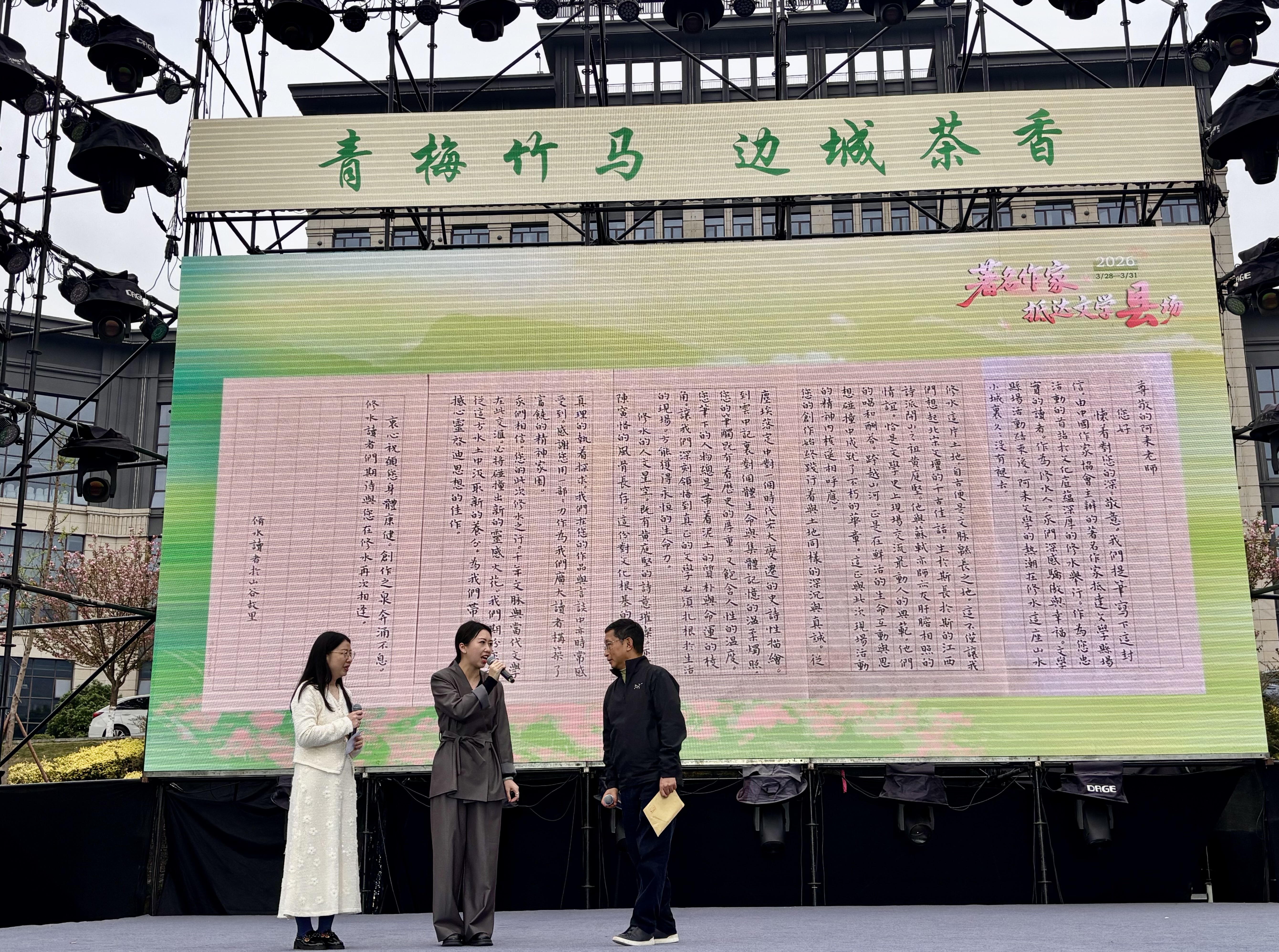活动现场还出现了一位特别的客人——专程从江西修水赶来的修水县文联相关负责人。她他说,阿来去年到访修水后,当地迅速掀起“阿来热”与文学热潮,极大提振了本地文艺工作者的创作自信,让基层文学生态更加丰盈。此次来到马边,他受修水读者们托付,亲手将一封毛笔书写的感谢信交到阿来手中,以表深深谢意。