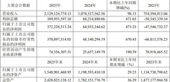 仕佳光子(688313)4月17日晚披露2025年年度报告,2025年度公司实现营业收入21.29亿元,同比增长98.15%;实现归属于上市公司股东的净利润3.72亿元,同比增长473.25%;归属于上市公司股东的扣除非经常性损益的净利润3.71亿元,同比增长670.45%;经营活动产生的现金流量净额7455.63万元,同比增长190.59%。